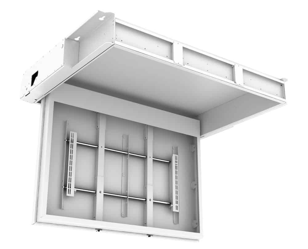 The TV Ceiling Hinge Heavy mechanism allows a large flat screen television to be concealed horizontally within a ceiling and hinged down for viewing. The near silent motor system adds to the effortless and smooth transition from the concealed to viewing position. Ideal for when there is limited ceiling void space, the TV Ceiling Hinge Heavy allows large screens to be concealed unobtrusively within relatively small ceiling areas and offers a great space saving option for when floor or wall space is not available.