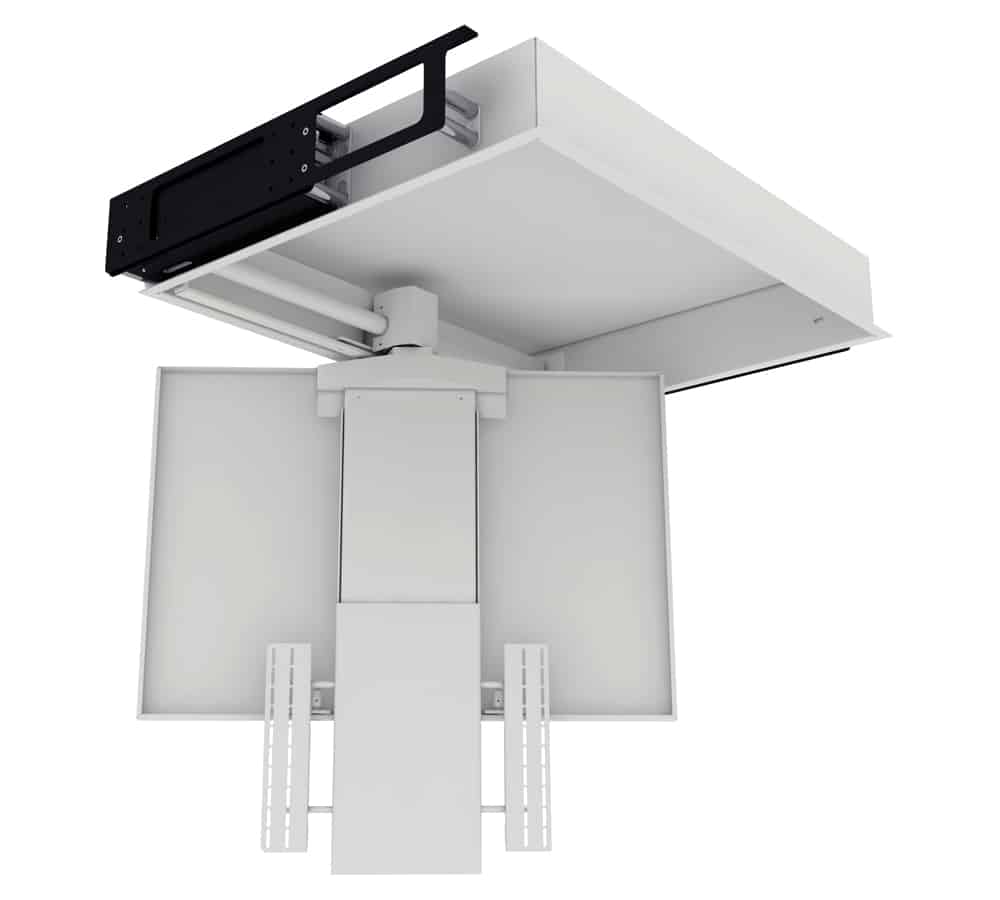The Ceiling Hinge with Telescope & Swivel mechanism allows a TV to be concealed horizontally within a ceiling, and hinged down through 90° for viewing then up to 600mm telescopic travel, and up to 180° swivel Ideal for applications where extra vertical travel is needed and multiple viewing positions are required, the CHTS allows large screens to be concealed unobtrusively when floor or wall space may not be available.